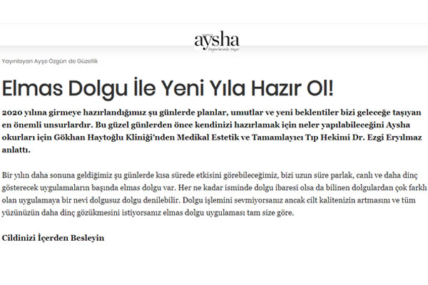 Beauty is shaped not only by results but also by knowledge. Dr. Ezgi Eryılmaz aims to create awareness by sharing innovations in medical aesthetics, scientific developments, and aesthetic approaches. Through interviews published in national and international digital magazines, television programs, and current news content; she focuses on naturalness in aesthetics, holistic health, and personalized approaches. Each content serves as a guide reflecting her experience in the field and aesthetic perspective. ✨ Explore media reflections and expert opinions.